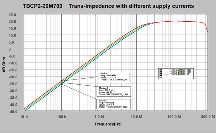下图展示了TBCP2-20M700探头在DC-400Hz频段、供电电流高达200A时的转移阻抗变化特性