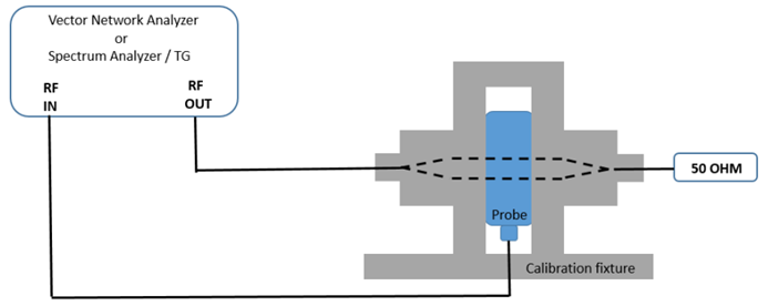 校准夹具与安装其上的探头共同构成特性阻抗约50欧姆的同轴传输线。探头一端连接信号源,另一端接50欧姆终端负载。矢量网络分析仪或频谱分析仪的接收端口连接至射频电流探头。电流探头的输出信号与流经探头夹具的电流呈函数关系,通过转换该信号即可获取探头的转移阻抗特性.